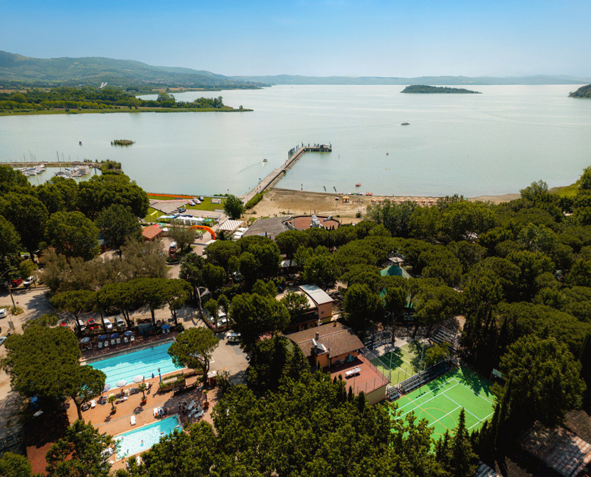Camping Punta Navaccia is a lively Italian campsite beautifully located on Lake Trasimeno, between Umbria and Tuscany. From your Villatent, you can enjoy stunning views of the lake and the surrounding green hills. The campsite features two swimming pools (one for adults and one for children) and a jacuzzi. Sports enthusiasts can make use of the tennis and basketball courts, mini football field and table tennis. During high season, the international entertainment team organises plenty of fun with sports tournaments, aqua aerobics, hiking trips and evening shows in the amphitheatre. For children, there’s a mini club, playground and adventure park, while teenagers can join in various sports activities. Facilities such as a bar, supermarket and a solarium with jazz music make your stay complete. Moreover, historic towns and nature reserves are within easy reach.